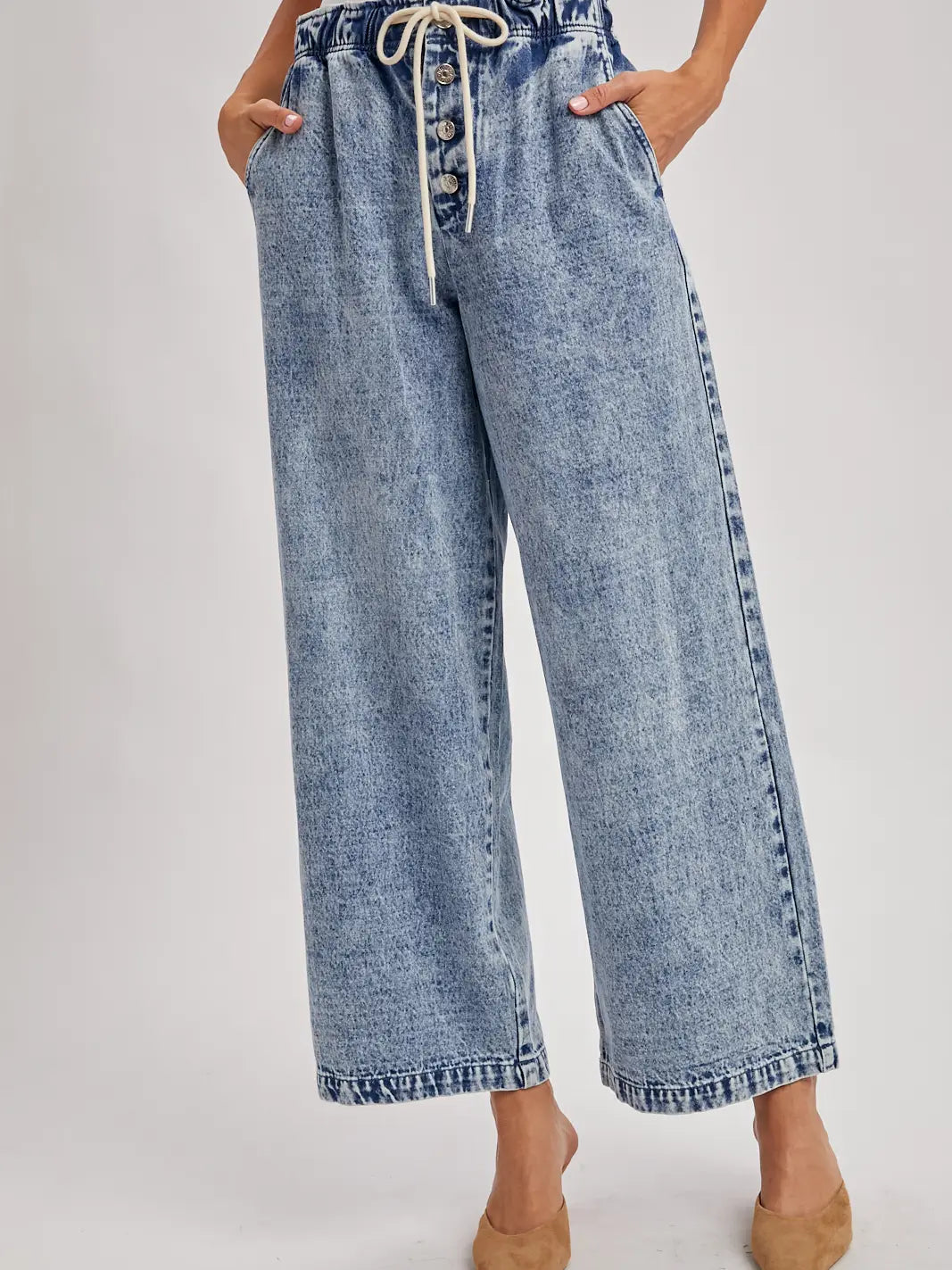 This is a pair of high-waisted, wide-leg denim jeans with a casual and comfortable aesthetic. The jeans feature an acid-wash or stone-wash finish, giving them a textured and slightly faded appearance. A key design element is the elasticated paperbag-style waistband, which is cinched with a contrasting cream-colored drawstring for an adjustable fit. Below the drawstring, a decorative button-fly with three prominent silver-toned buttons runs down the center. The pants have a relaxed, loose fit through the hips and thighs, falling into a wide, cropped leg that ends above the ankle, creating a modern culotte silhouette. -Model is 5'9" and wearing a Small