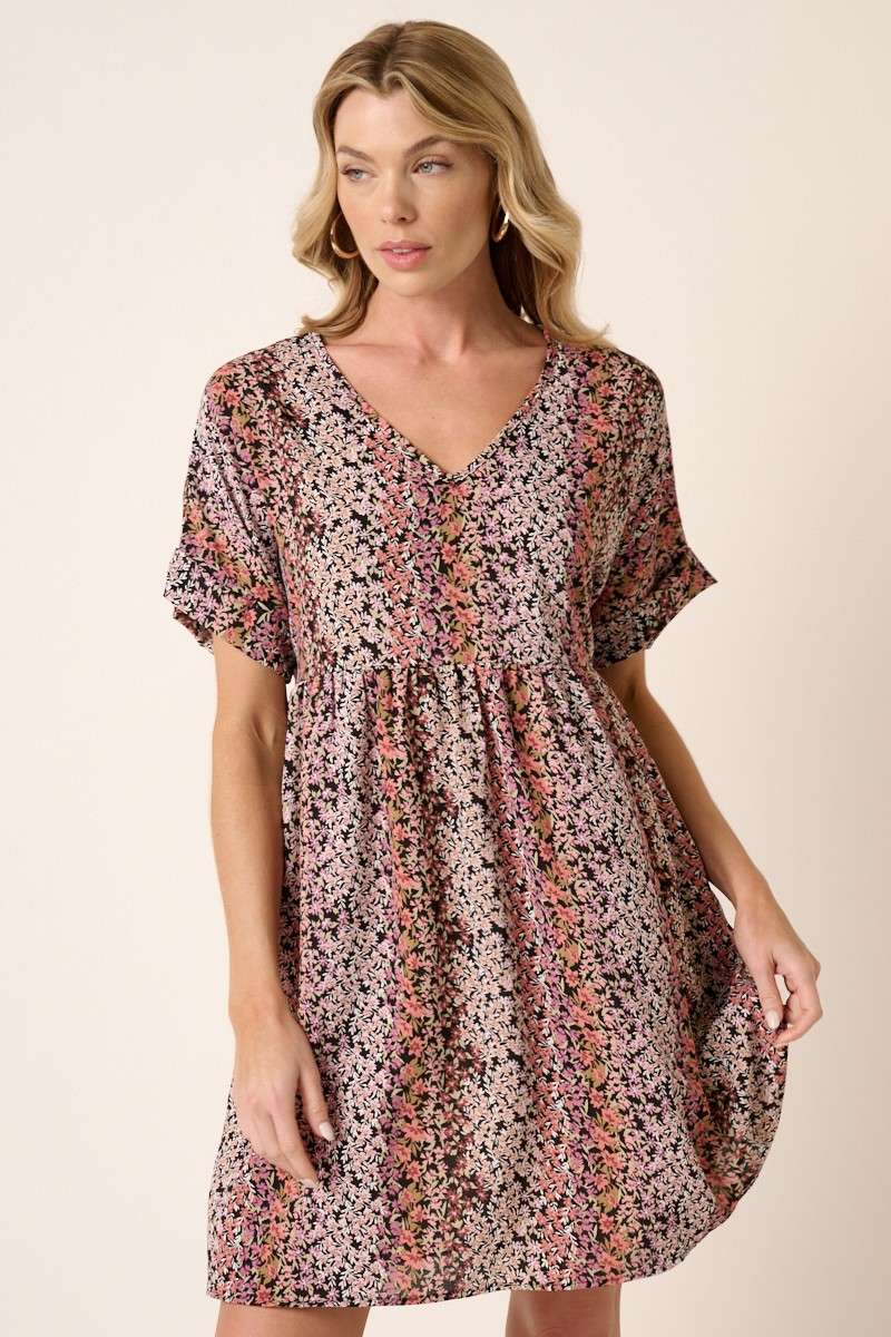 FLOWER PRINT V NECK BABYDOLL MINI DRESS
