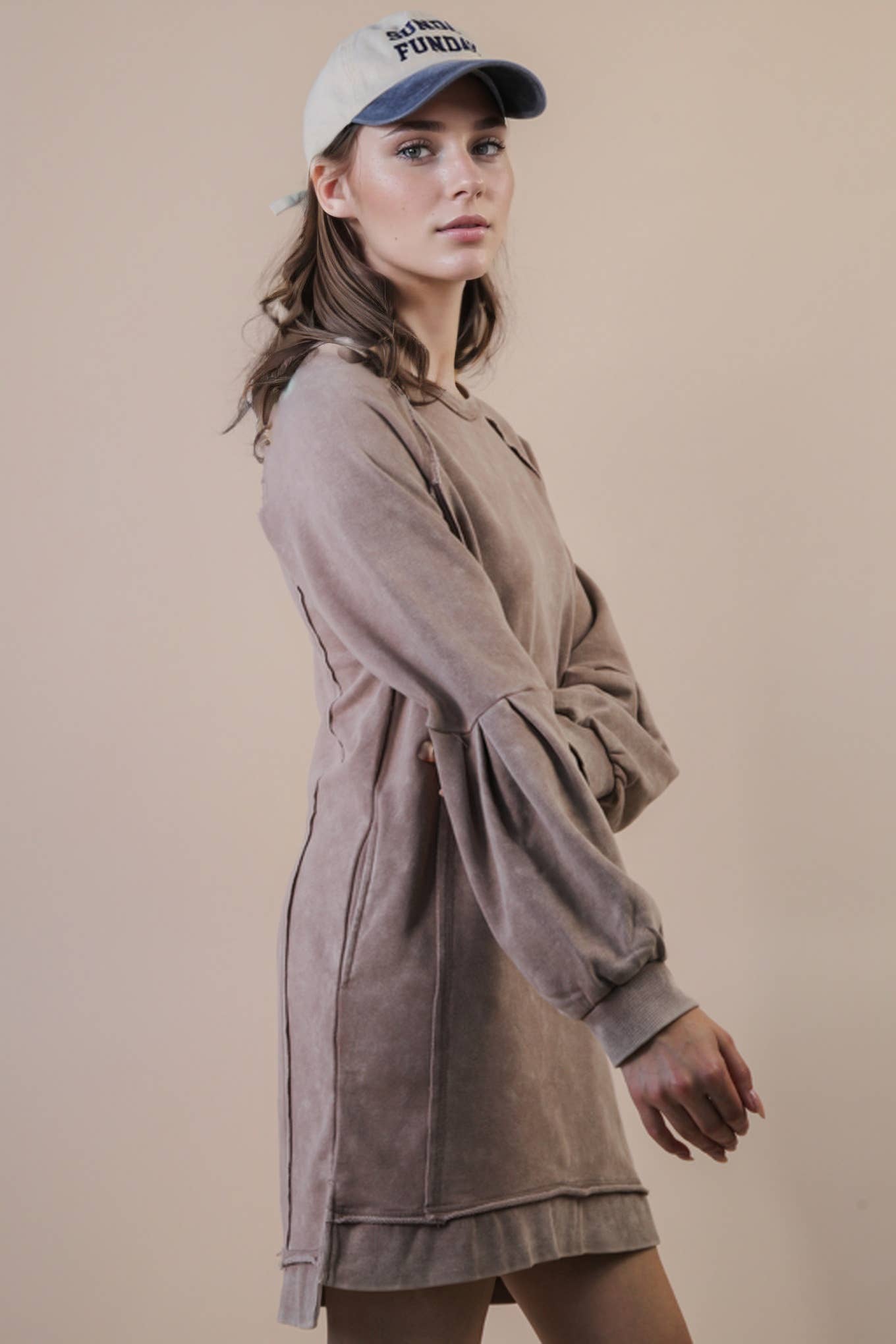 - Mineral Washed Raglan Sleeve Casual Mini Dress - Round Neck - Long Sleeve W/ Pleats Detail - Oversized - Frenchy Terry Knit (Model height: 5"7"