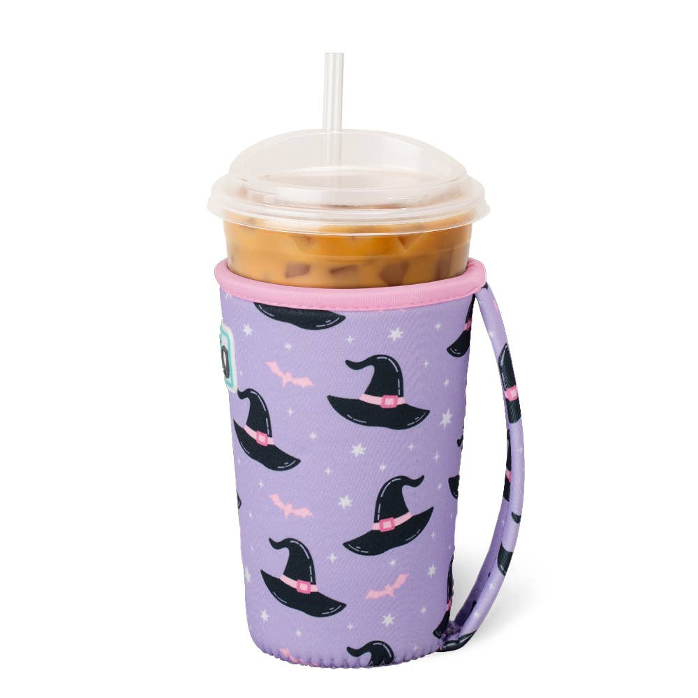 Cool drinks, dry hands! 🧊☕Midnight bats and stars float among whimsical witch hats on a lavender background.
