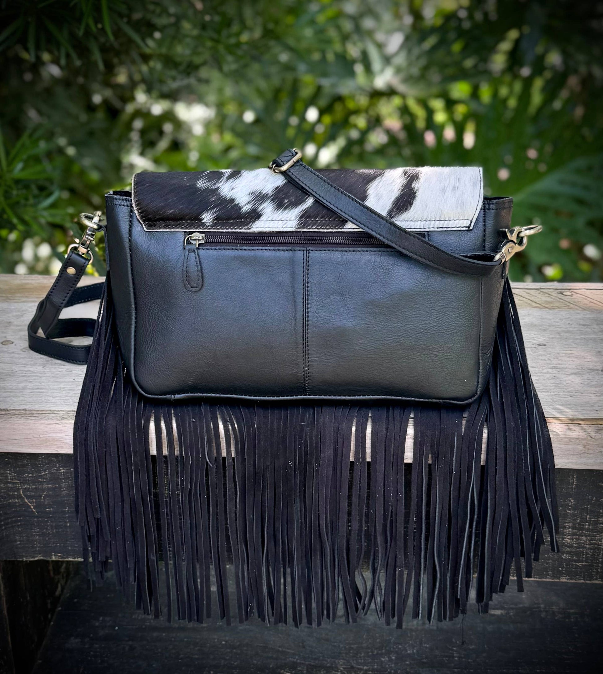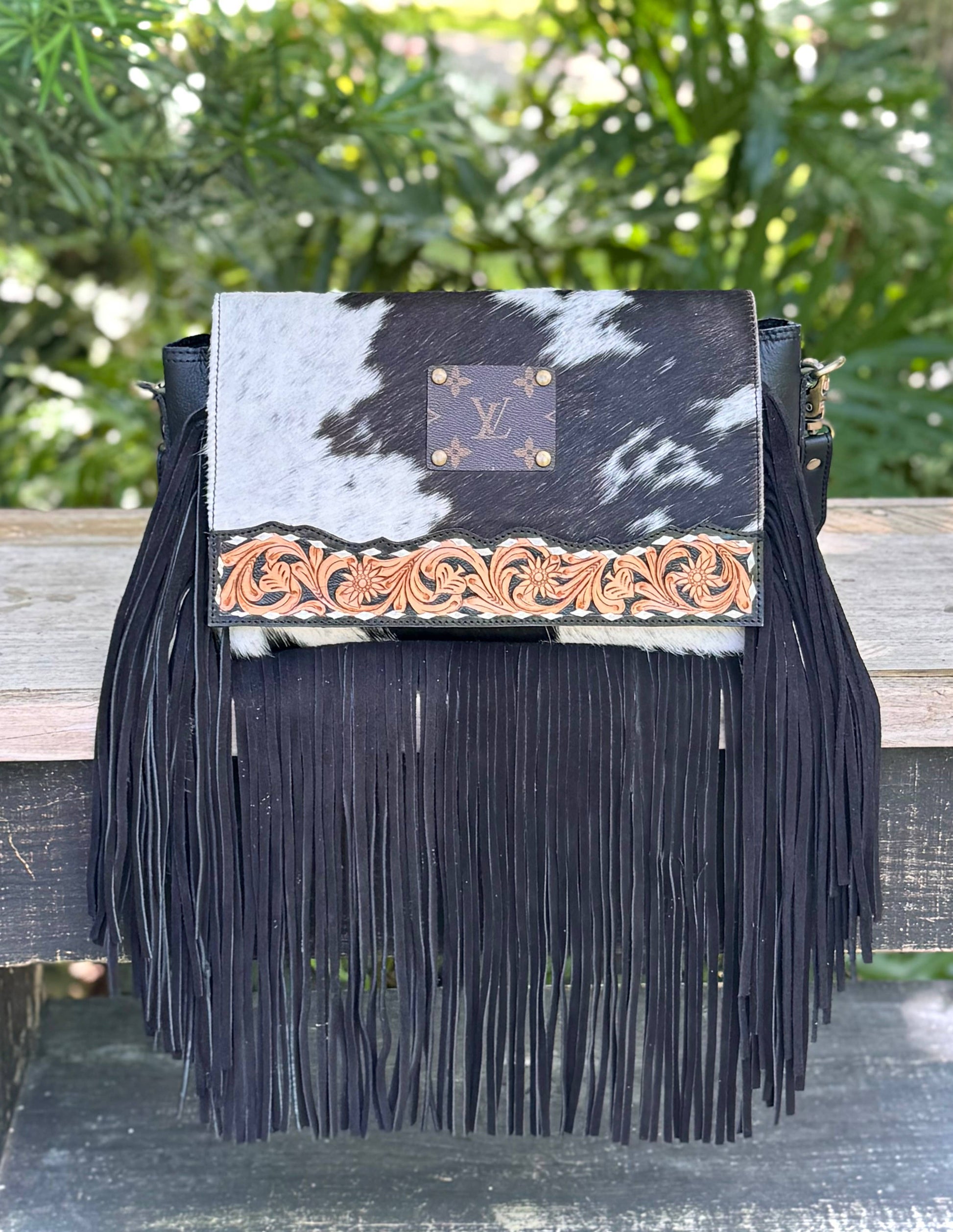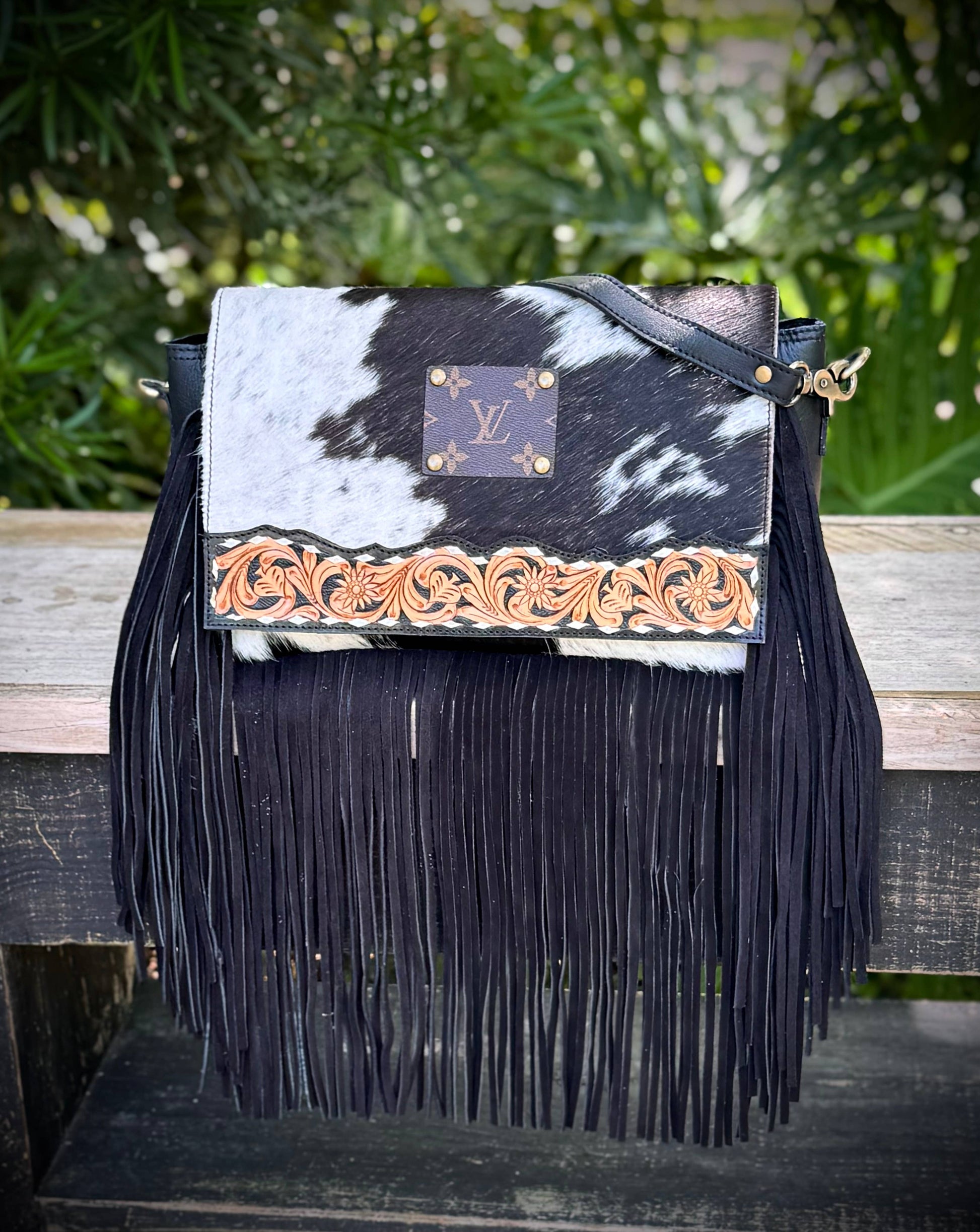 Upcycled LV Cowhide Leather Fringe Crossbody Bag Western